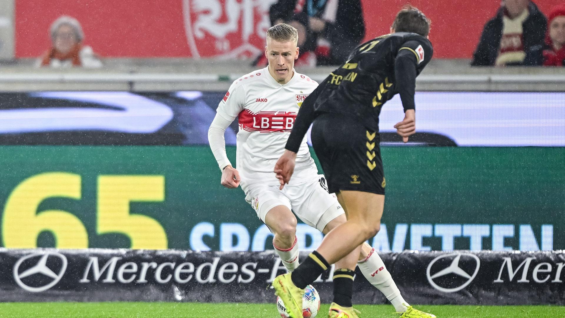 1:0 führt der VfB Stuttgart im Bundesliga-Topspiel gegen den 1. FC Köln. Demirovic traf in der 15. Minute für die Schwaben.